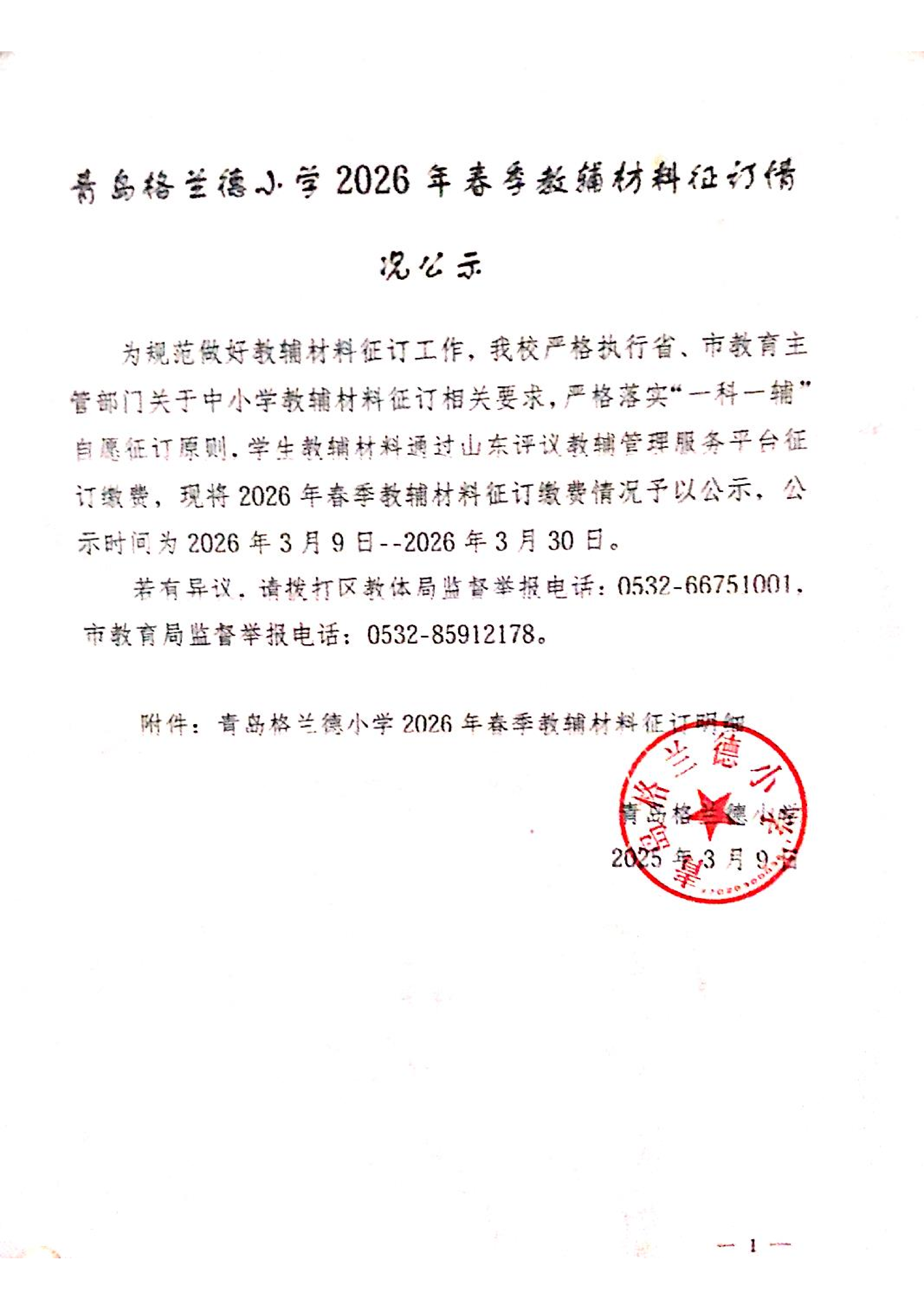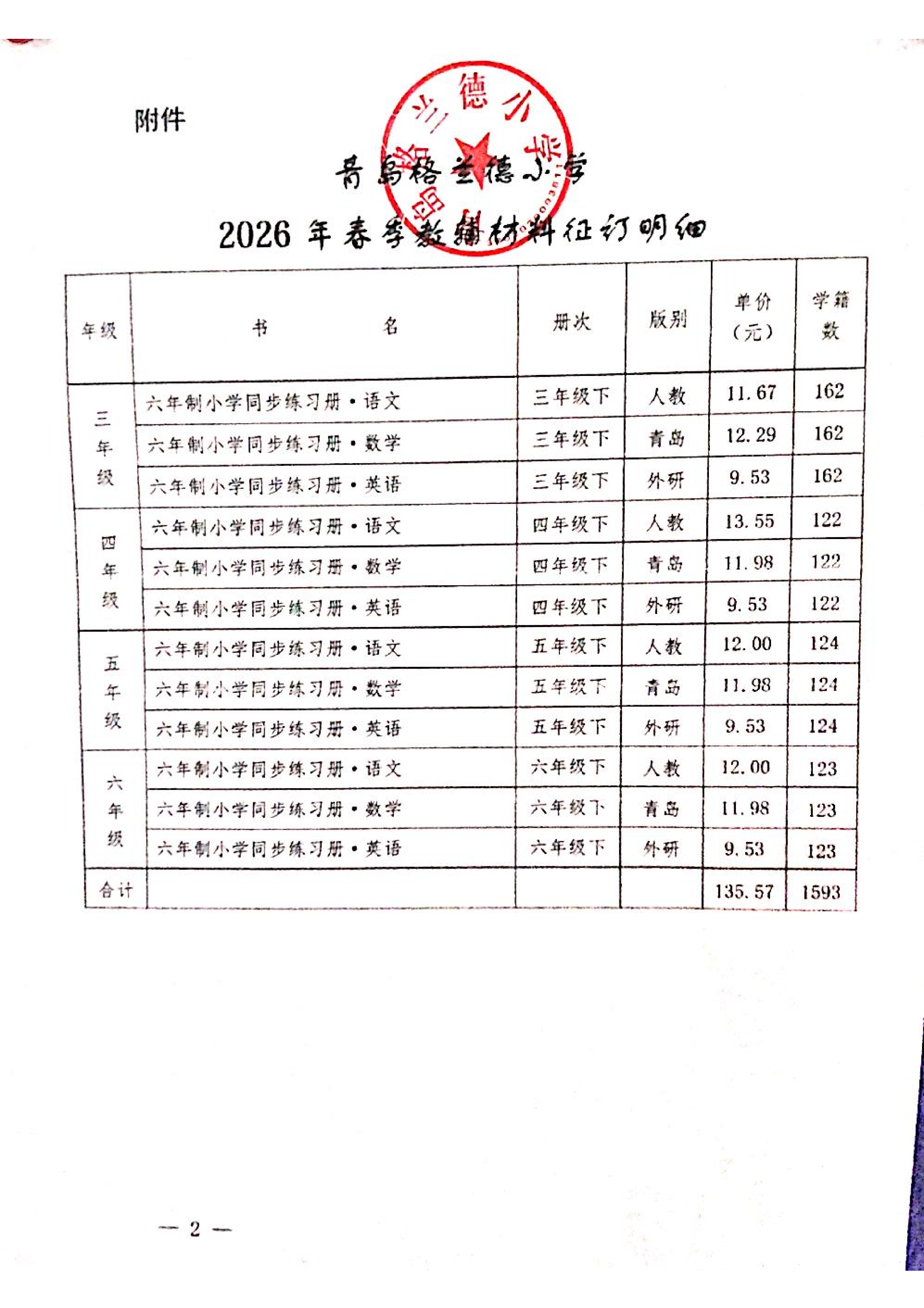 青岛格兰德小学2026年春季教辅材料征订情况公示
